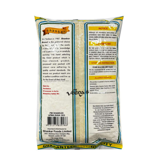 Details Ingredients Allergens Details Shankar Upma Rava 1kg is made from finely milled quality wheat, perfect for preparing soft and fluffy upma every time. Its consistent texture ensures even cooking and great taste in every bite. Ideal for breakfast or light meals, this rava is easy to cook and versatile....