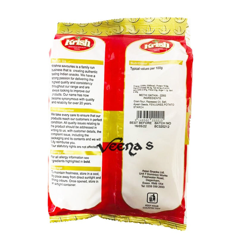 Savor the unique flavor and crispy crunch of Krish Methi Gathia, a traditional Indian snack that combines the rich taste of fenugreek (methi) with the light, airy texture of gathia. Made from high-quality gram flour and infused with aromatic fenugreek leaves, these golden-brown snacks are seasoned to perfection for a deliciously savory experience. Ideal for snacking on its own, adding to party mixes, or using as a flavorful topping, Krish Methi Gathia offers a satisfying crunch and distinctive taste in every bite.