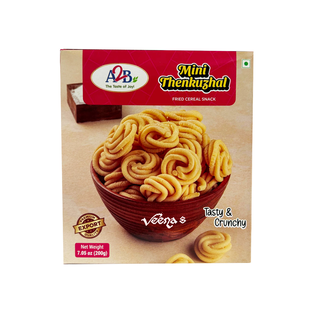 A2B Mini Thenkuzhal (200g) is a delightful South Indian snack made with rice flour and a special blend of spices, offering a perfect balance of crispy texture and savory flavor. These bite-sized, crunchy spirals are traditionally prepared and are ideal for pairing with tea, enjoying as a snack, or serving as an appetizer. With its authentic taste and satisfying crunch, A2B Mini Thenkuzhal brings a homemade touch to your snack time. Each 200g pack provides a convenient and delicious option for sharing or savoring on your own.