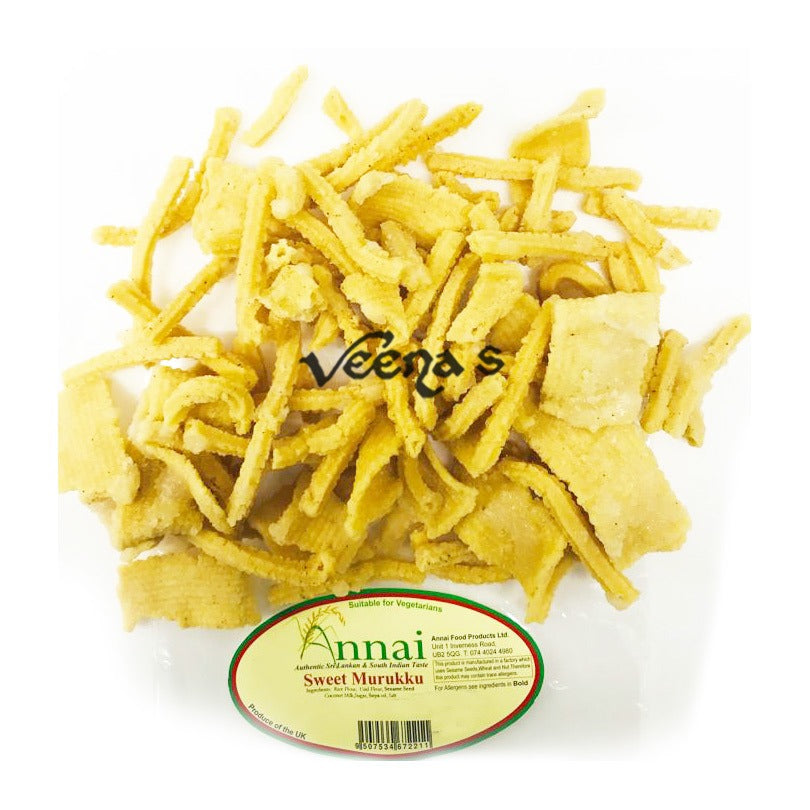 Delight in the unique and delectable taste of Annai Sweet Murukku, a charming twist on the classic South Indian snack. This sweet variant of the traditional murukku is crafted from high-quality rice flour and lentil flour, then delicately seasoned with a hint of sugar and aromatic spices. Each piece is expertly fried to a perfect crisp, offering a deliciously crunchy texture with a subtle sweetness that makes it a delightful treat for any time of the day. Ideal for festive celebrations, family gatherings, or as a special indulgence, Annai Sweet Murukku adds a touch of sweetness to your snack time.