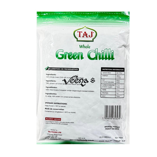 Details Ingredients Allergens Details Bold Heat. Authentic Flavour. Taj Whole Green Chillies are freshly frozen to retain heat and flavour. Ideal for curries, stir-fries, chutneys, and pickling. Convenient alternative to fresh chillies. Maintains colour and spice level after cooking. A kitchen essential for spicy dishes. Buy Online at Veena’s in...