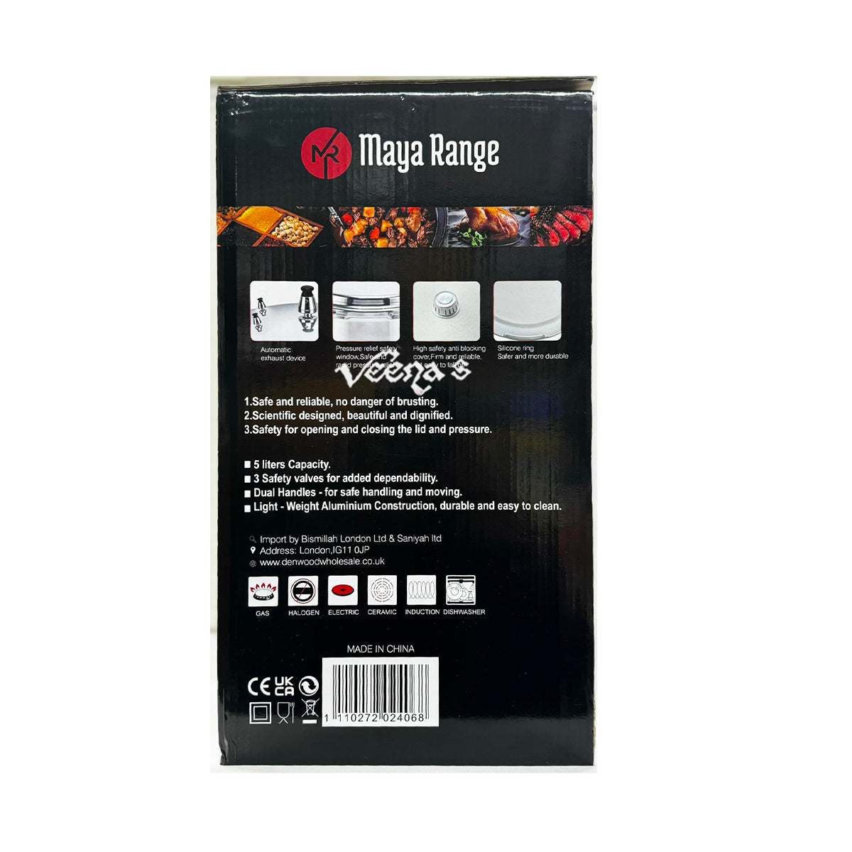 Cook faster and more efficiently with the Maya Range Aluminum Pressure Cooker 5L (MR-1136)—a reliable kitchen essential built for everyday use. Crafted from high-quality aluminum, this pressure cooker ensures even heat distribution for perfectly cooked meals every time. With a 5-litre capacity, it's ideal for families and batch cooking, whether you're preparing rice, dal, curries, or stews. The secure locking mechanism, heat-resistant handle, and safety valve offer enhanced protection and ease of use. Durable, lightweight, and easy to clean, this pressure cooker brings speed, safety, and convenience to your kitchen.