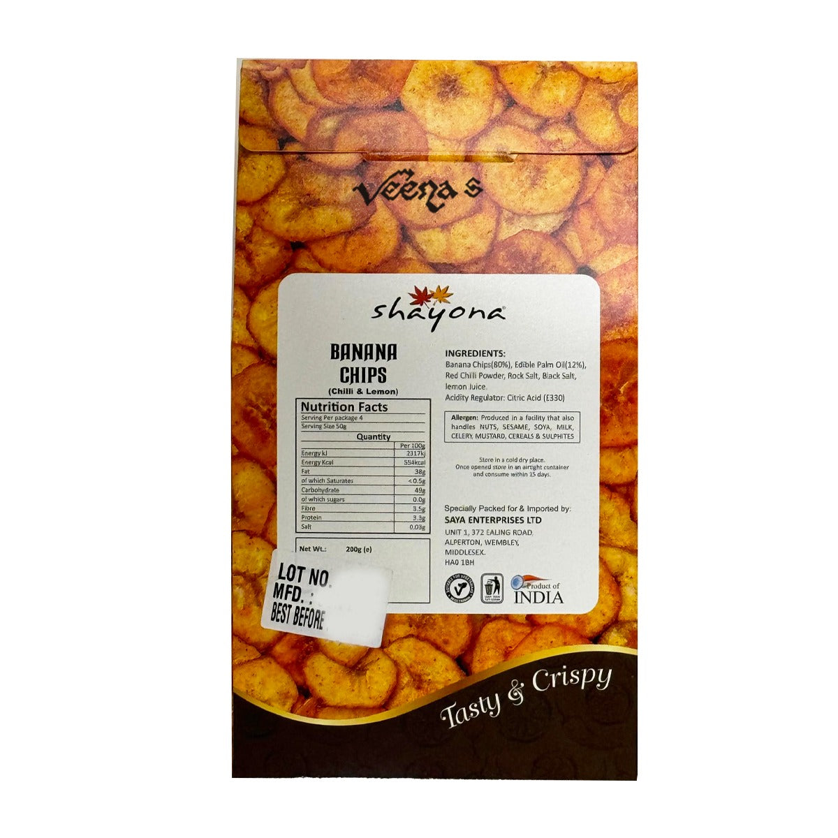 Shayona Banana Chips (Chilli & Lemon) offer a deliciously crunchy and tangy snacking experience. Made from premium raw bananas, these chips are carefully sliced, fried to a perfect crisp, and seasoned with a zesty blend of chili and lemon, delivering a delightful kick with every bite.