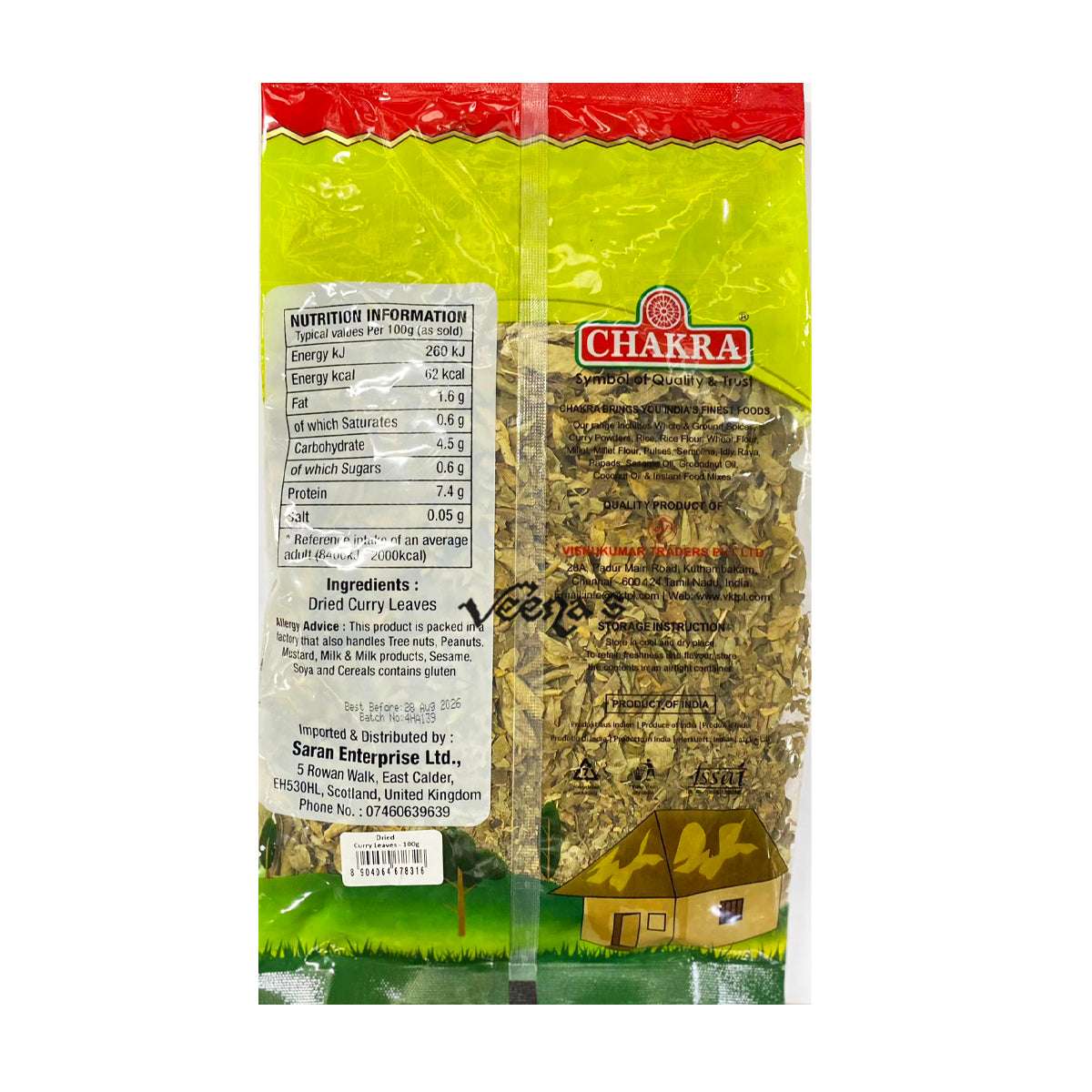 Chakra Dried Curry Leaves bring authentic South Indian aroma to your dishes. These leaves are carefully dried to preserve flavour and natural fragrance. Ideal for tempering in curries, sambar, rasam, and vegetable stir-fries. Convenient alternative to fresh curry leaves with long shelf life. Enhances taste with just a small quantity. Available for authentic cooking when you Buy Online at Veena’s in UK.