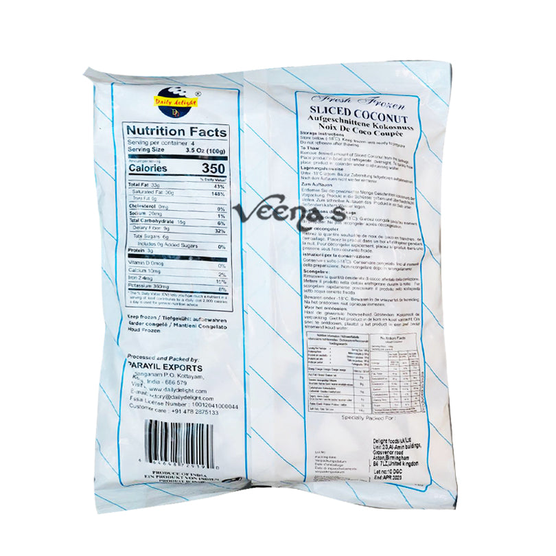 Enjoy the tropical goodness of Daily Delight Frozen Sliced Coconut, a convenient and versatile ingredient that brings the fresh taste of coconut to your culinary creations. Sliced from ripe coconuts and frozen to preserve its natural sweetness and texture, Daily Delight Frozen Sliced Coconut offers a convenient way to incorporate this nutritious fruit into your cooking. Whether used in desserts, curries, smoothies, or as a topping for various dishes, these frozen coconut slices maintain their freshness and flavor, providing a delightful addition to a variety of recipes.