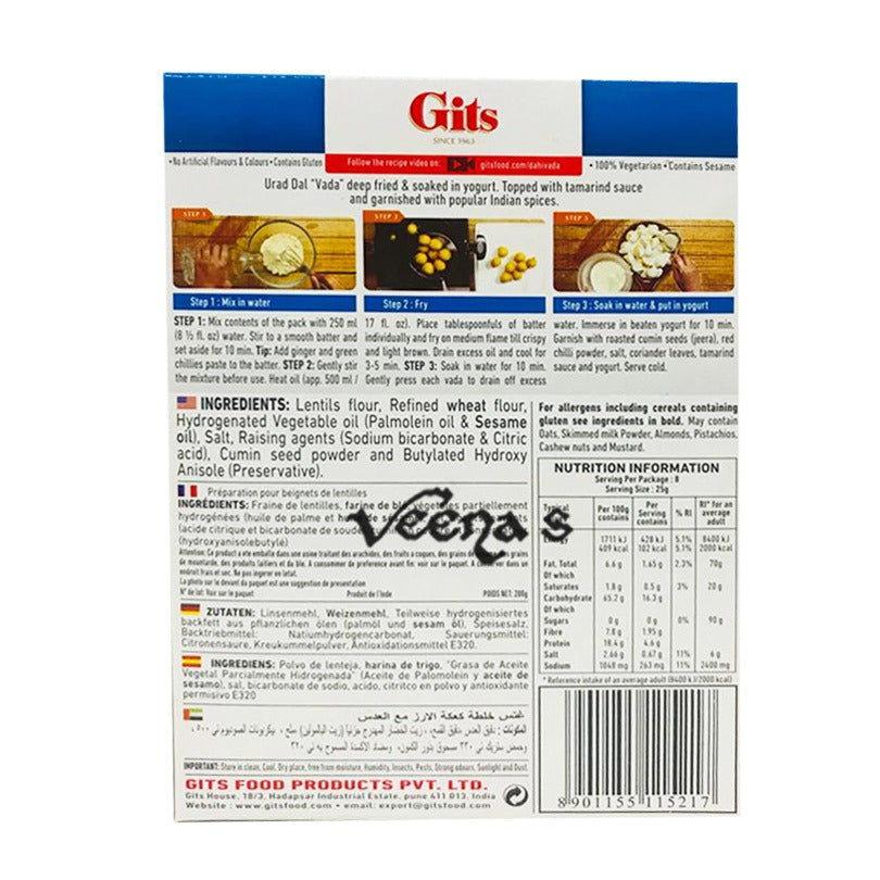 Gits Dahi Vada Mix is a ready-to-use mix for preparing soft, fluffy, and delicious dahi vadas at home. Made from high-quality lentils and carefully selected ingredients, this mix ensures authentic taste and perfect texture without the need for soaking or grinding.