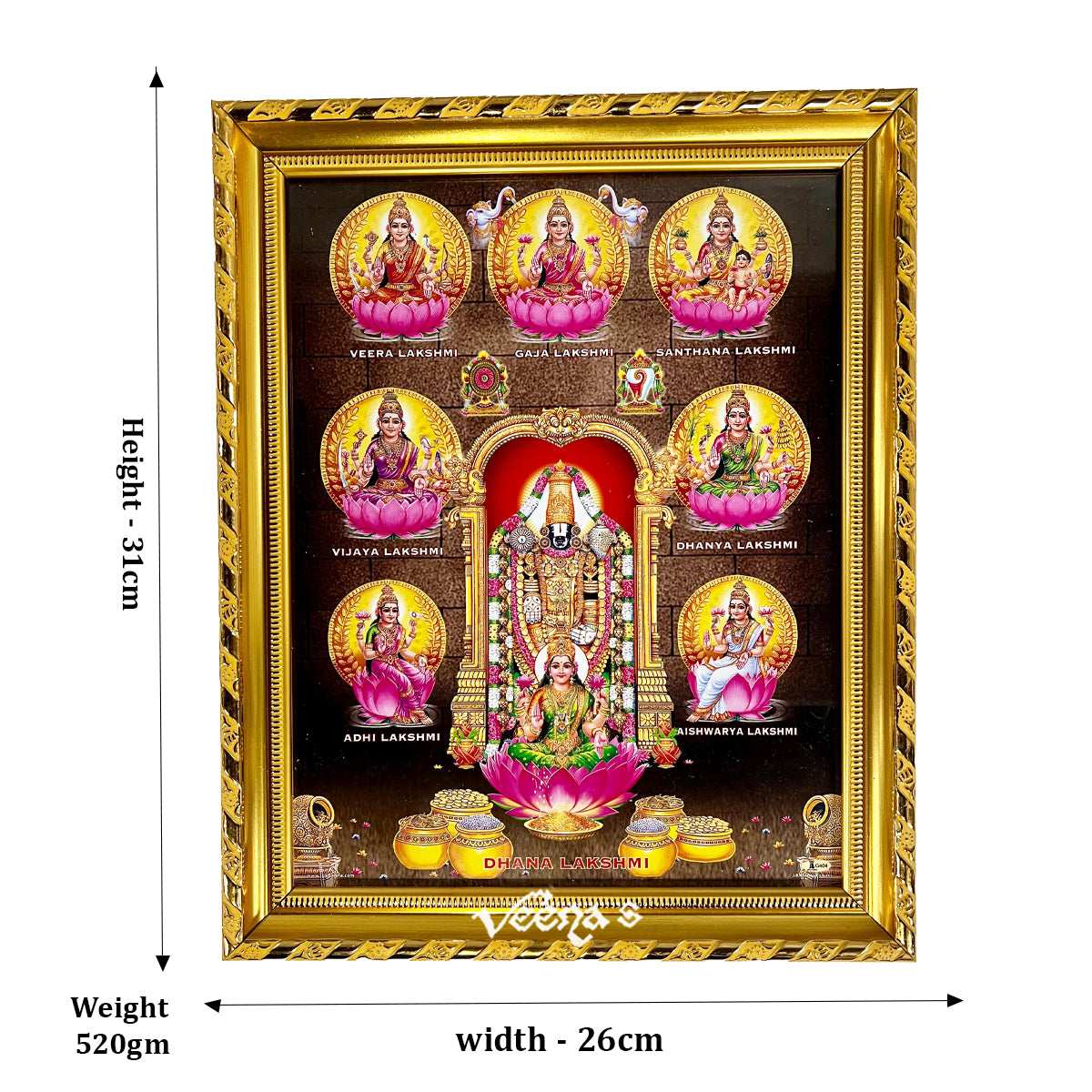 Enhance your spiritual sanctuary with this exquisite Hindu God Photo Frame featuring Lord Perumal alongside other revered Goddesses. Measuring 31cm x 26cm, this beautifully designed frame captures the divine presence and harmony of these celestial figures, making it a perfect addition to your home or office decor.
