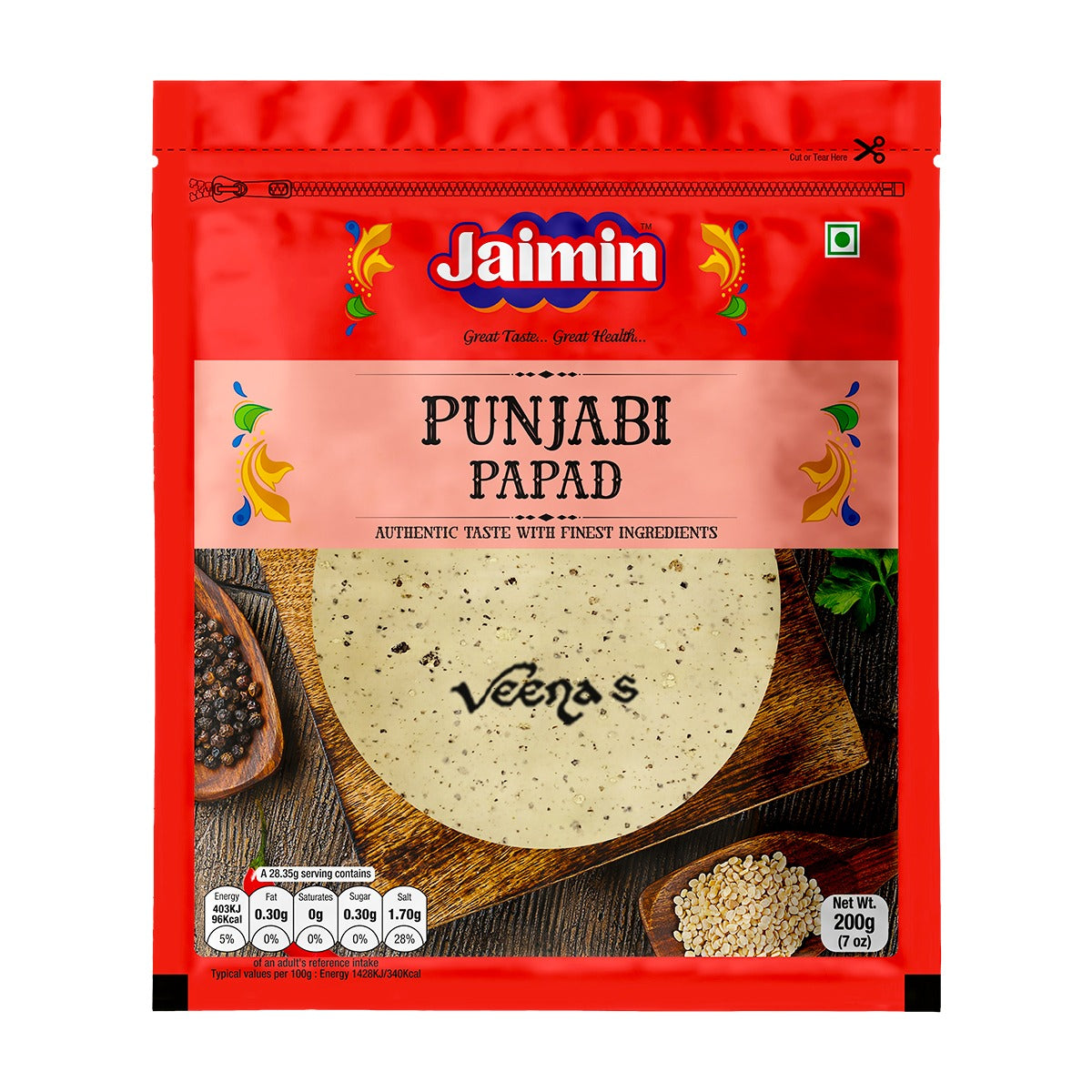 Jaimin Punjabi Papad 200g is a crispy and flavourful Indian papad made using traditional Punjabi spices for an authentic taste. Light, crunchy, and easy to roast or fry, it is perfect as a starter or side dish with everyday meals. Enjoy it plain or topped with onions, tomatoes, and chutneys for extra flavour. Ideal for family meals and festive occasions alike. Buy Online at Veena’s in UK for convenient shopping and trusted quality.