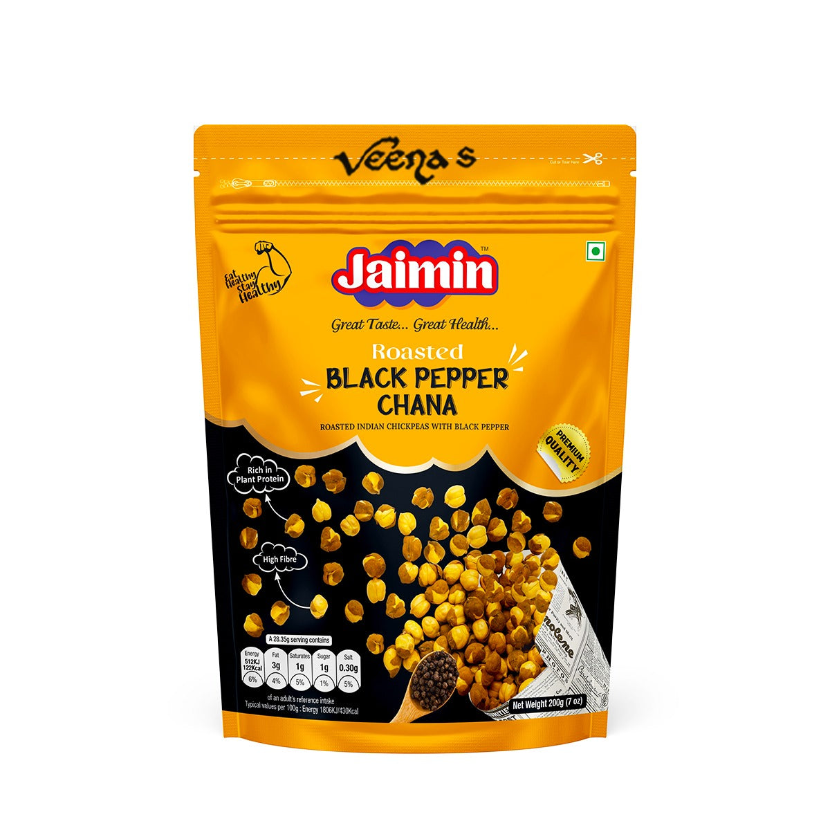 Savor the bold and crunchy goodness of Jaimin Roasted Black Pepper Chana, a flavorful snack that combines roasted chickpeas with a zesty black pepper seasoning. These chickpeas are roasted to perfection, offering a satisfying crunch with each bite. Seasoned with aromatic black pepper, this snack delivers a spicy kick that enhances its savory taste. Ideal for enjoying on its own or as a topping for salads and soups, Jaimin Roasted Black Pepper Chana is a nutritious and delicious choice for snack lovers. Experience the rich flavors and wholesome goodness of this snack, perfect for any occasion.