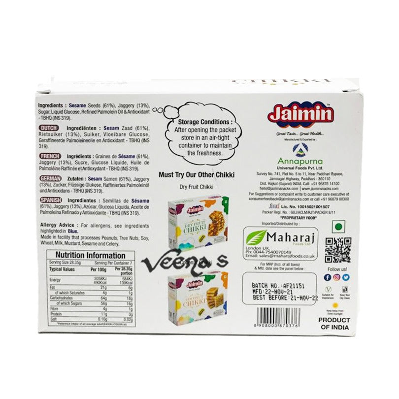 Jaimin Sesame Chikki offers a delightful blend of crunchy sesame seeds and rich jaggery sweetness, crafted into traditional Indian brittle. Each piece of chikki embodies the perfect balance of nutty sesame flavor and the natural sweetness of jaggery, making it a beloved snack across India. Whether enjoyed as a quick energy boost or as a sweet treat with tea or coffee, Jaimin Sesame Chikki promises a satisfying crunch and a burst of authentic flavors. Embrace the timeless tradition of Indian sweets with Jaimin Sesame Chikki, where every bite brings joy and nostalgia.