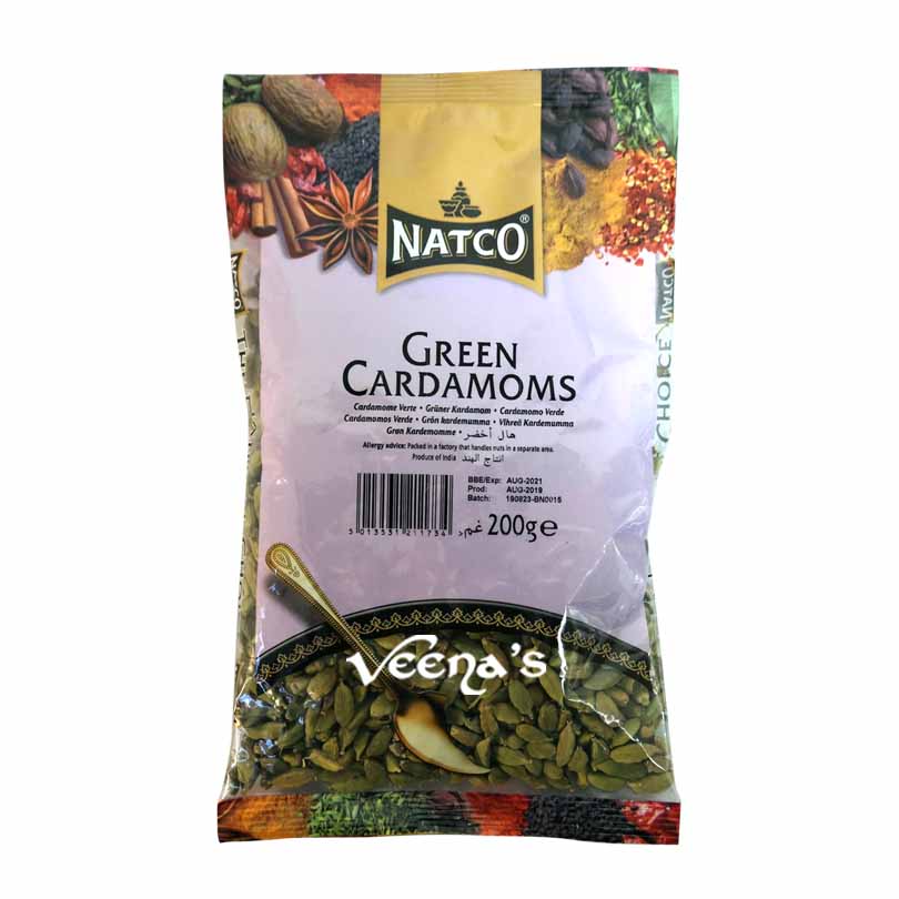 Natco Green Cardamoms are aromatic and flavourful. Commonly used in sweets, teas, and savoury dishes. Adds premium fragrance to recipes. Carefully selected whole pods for quality. A must-have spice when you Buy Online at Veena’s in UK.